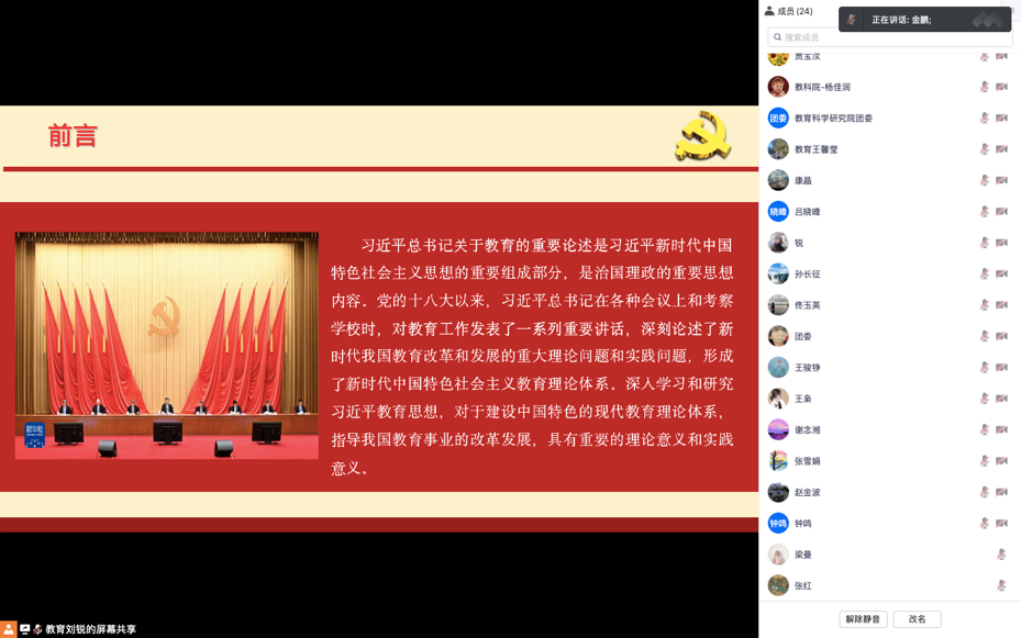 会上,金鹏首先对习近平总书记关于教育的重要论述进行回顾,引导教师立足于实践,脚踏实地地做好新时代的建设者,在新时代新征程上坚持改革创新,为实现中国式教育现代化贡献出自己的一份力量。接着,金鹏从如何深入学习习近平总书记关于教育的重要论述出发,指出教师党员要持续学习政治理论知识,重在实践,贵在落实。作为国家的教育工作者,要努力钻研,厚植爱国主义情怀,将专业知识传递到课堂教学中、社会实践中,在实践中感悟,在锻炼中成长,更要认真全面贯彻党的教育方针,落实立德树人根本任务。最后,金鹏介绍黑龙江省“4567”现代产业体系驱动经济高质量发展,号召教师加快知识更新、优化知识结构,强化知行合一,为服务龙江、振兴发展贡献力量。