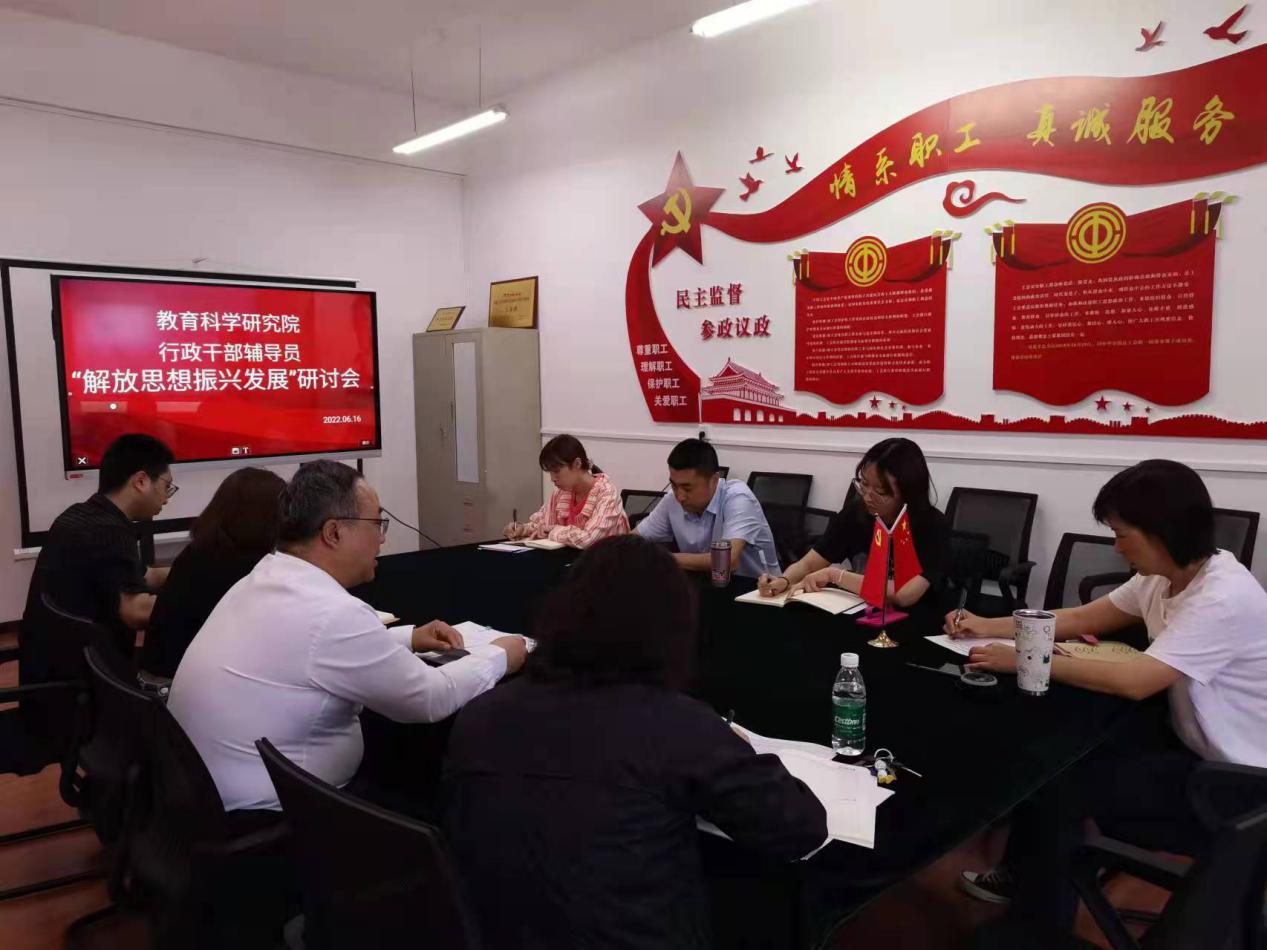为激励干部教师担当作为,提高工作质效,2022年6月16日9时,教育科学研究院召开行政干部辅导员“解放思想振兴发展”研讨会,会议由党总支书记金鹏主持,学院全体行政干部、辅导员参会。