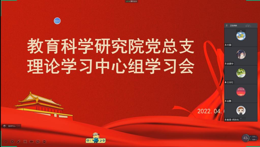 为深入贯彻习近平总书记重要讲话和全国两会精神,进一步统一思想,明确方向,2022年4月6日14时,教育科学研究院党总支理论学习中心组结合全国两会精神学习辅导讲座视频《辉煌征程展宏图》,重点对全国两会精神开展专题研讨,会议由党总支书记金鹏主持,中心组全体成员参会,院长王世红列席会议。