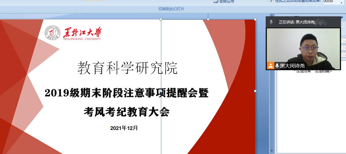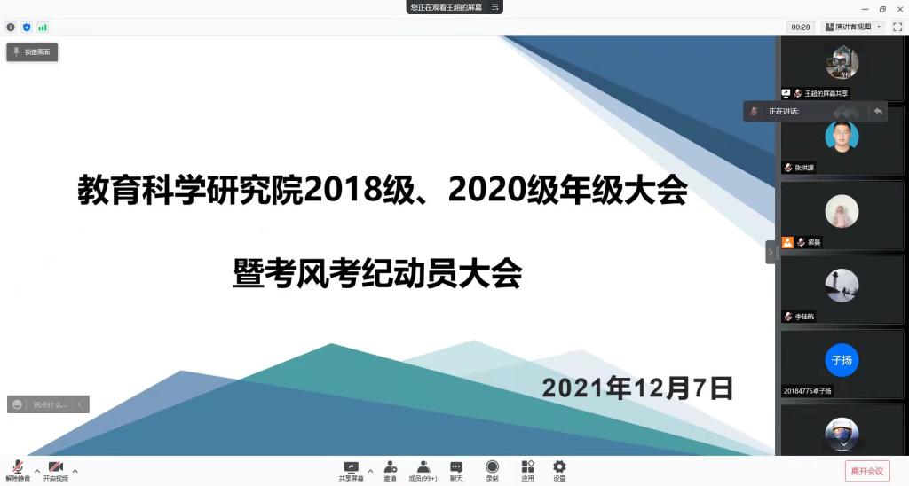 为推动近期考试的顺利进行,结合疫情防控工作的有关要求,2021年12月7日教育科学研究院于腾讯会议平台举行考风考纪教育暨安全教育大会。本次会议由各年级辅导员老师主持,全体同学参会。