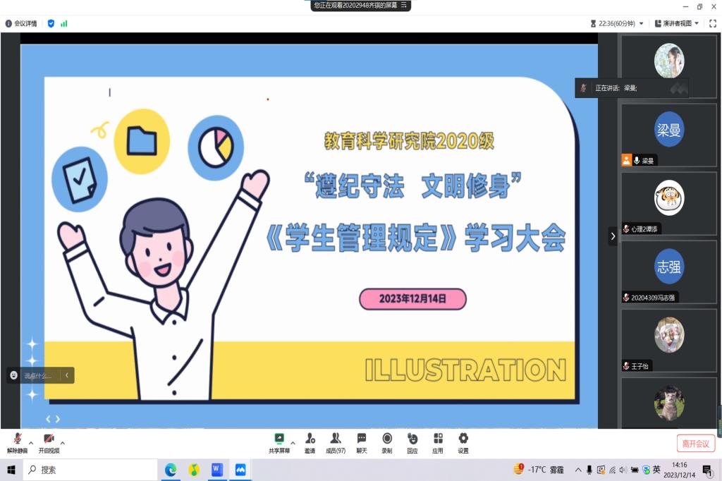 以文明铸魂,以涵养修身。本次“遵纪守法 文明修身”主题班会有效覆盖我院全体同学,借助多种形式,线上线下相结合,促使同学们深入学习和掌握校规校纪,树牢规则意识,守住安全底线。我院将以此次班会为契机,进一步完善各种规章制度,加大学院秩序的管理力度,创造良好的学习、生活环境,把纪律约束变为一种自觉的约束,把自觉的行为习惯升华为一种文明素养,做到行有所戒、行有所止,助力构建风清气正的校园环境。(教育科学研究院供稿)