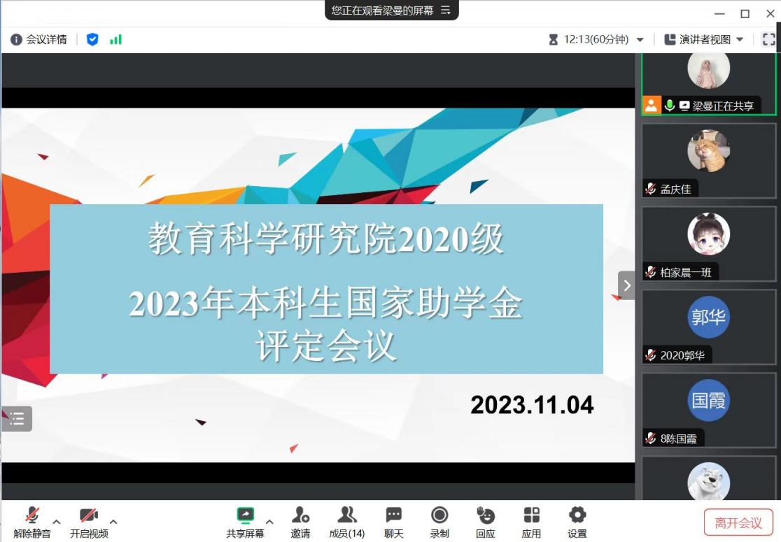 《学生工作部:关于评定2023年国家助学金的通知》的要求,本着公平、公正、公开的原则,结合教育科学研究院2023年家庭经济困难学生认定工作的实际情况,各年级辅导员于2023年11月4日至6日间召开了2023年国家助学金评定会议。会议由各年级辅导员主持,各年级相关学生参加。