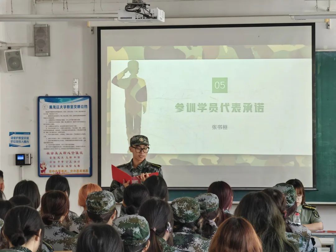 2022级张书桓同学作为学生代表进行发言,他向同学们阐述了军训的重要意义及作用,随后他代表2022级全体同学向领导、教官、老师们郑重地做出了承诺,将以认真负责的态度对待军训并积极参与各项训练活动,努力提升自己的身体素质和军事素养,用实际行动诠释他们的决心和承诺,顺利完成本次军训。
