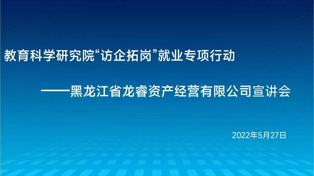 ”访企拓岗”促就业的专项行动,教育科学研究院于2022年5月27日晚18时通过腾讯会议召开黑龙江省龙睿资产经营有限公司线上专场宣讲会。本次会议由2019级辅导员闵诗尧老师主持,学院党总支书记金鹏、学院院长王世红老师、院党总支副书记付丽和副院长佟玉英老师,黑龙江省龙睿资产经营有限公司组织人事部的冷杉老师及各年级学生参加。
