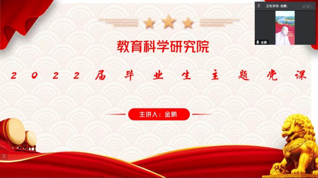 为进一步加强毕业生党员的理想信念教育,引领毕业生党员立大志、明大德、成大才、担大任,教育科学研究院于2022年5月25日上午9时开展2022届毕业生主题党课,本次党课由学院党总支书记金鹏主讲,2018级学生党支部书记刘锐、2018级辅导员梁曼及全体毕业生党员参会。