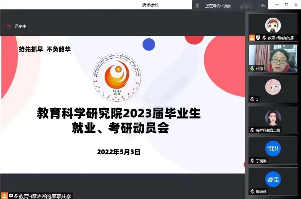 为切实推进2023届毕业生就业、考研工作,实现应届毕业生高质量就业,同时明确学生的就业、考研目标,在学院内,营造积极向上的学风。教育科学研究院于2022年5月3日19时30分线上开展“2023届毕业生就业、考研动员会”。本次会议由2023届辅导员闵诗尧主持,院党总支书记金鹏,院长王世红,院党总支副书记付丽,应用心理学教师王殿春出席,2023届毕业生及学生家长参加。