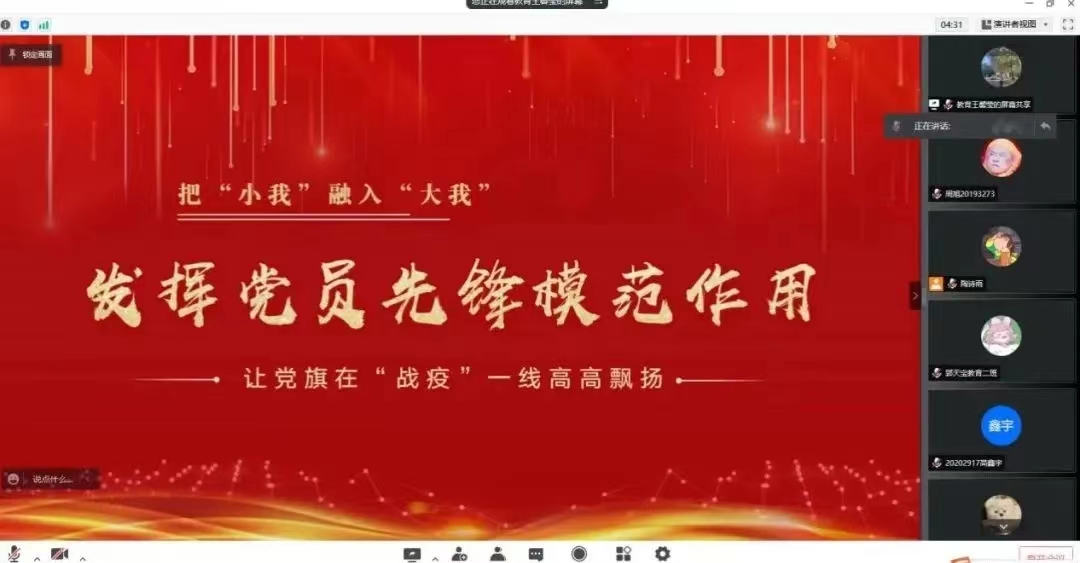 本次云端授课由2021级辅导员王馨莹以《发挥党员先锋模范作用,让党旗在“战疫”一线高高飘扬》为题为第39期全体培训班成员进行授课指导。