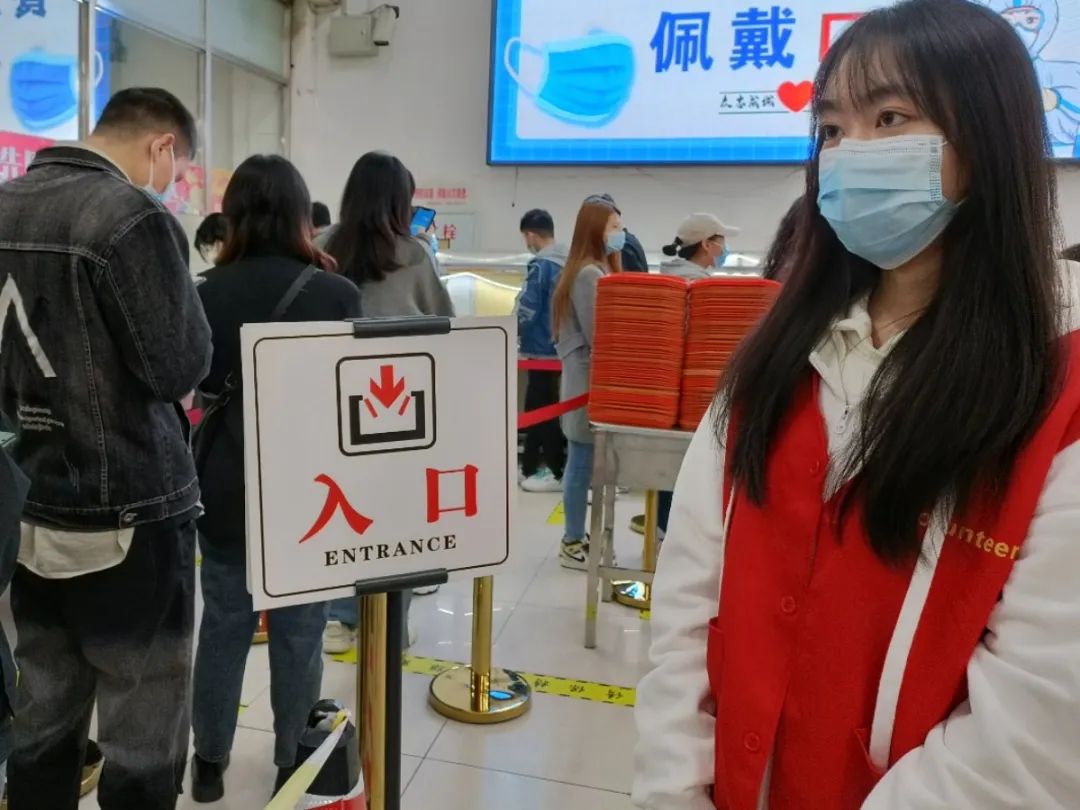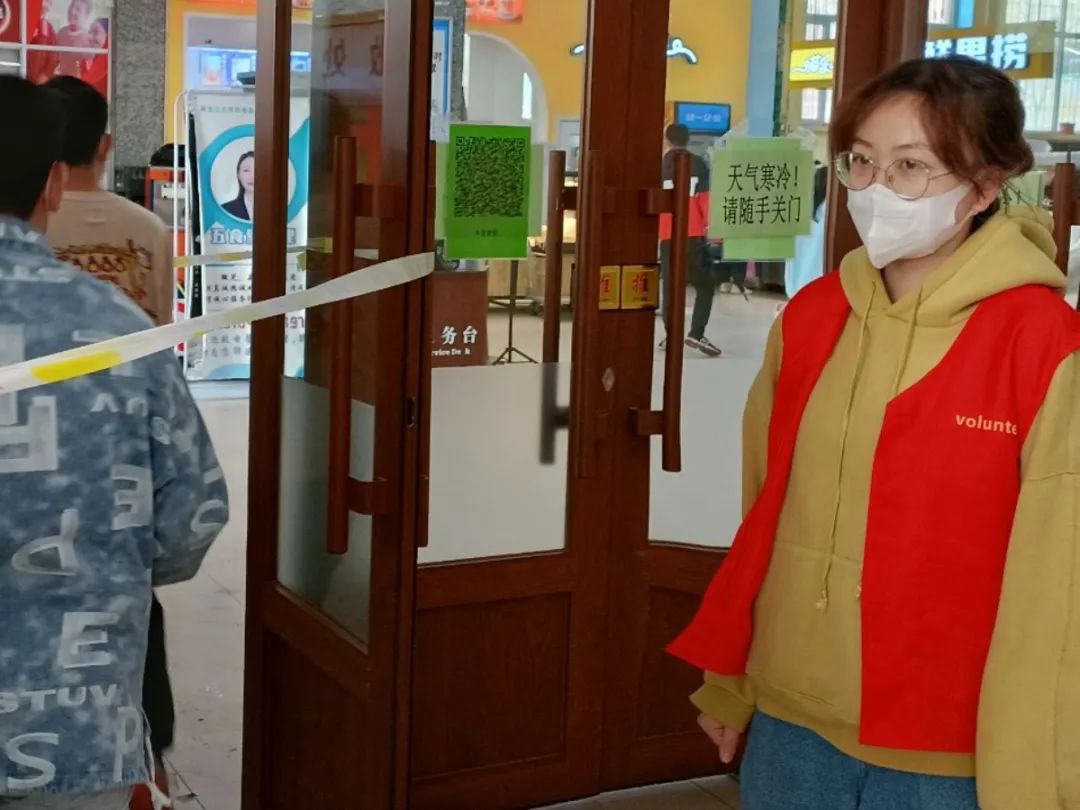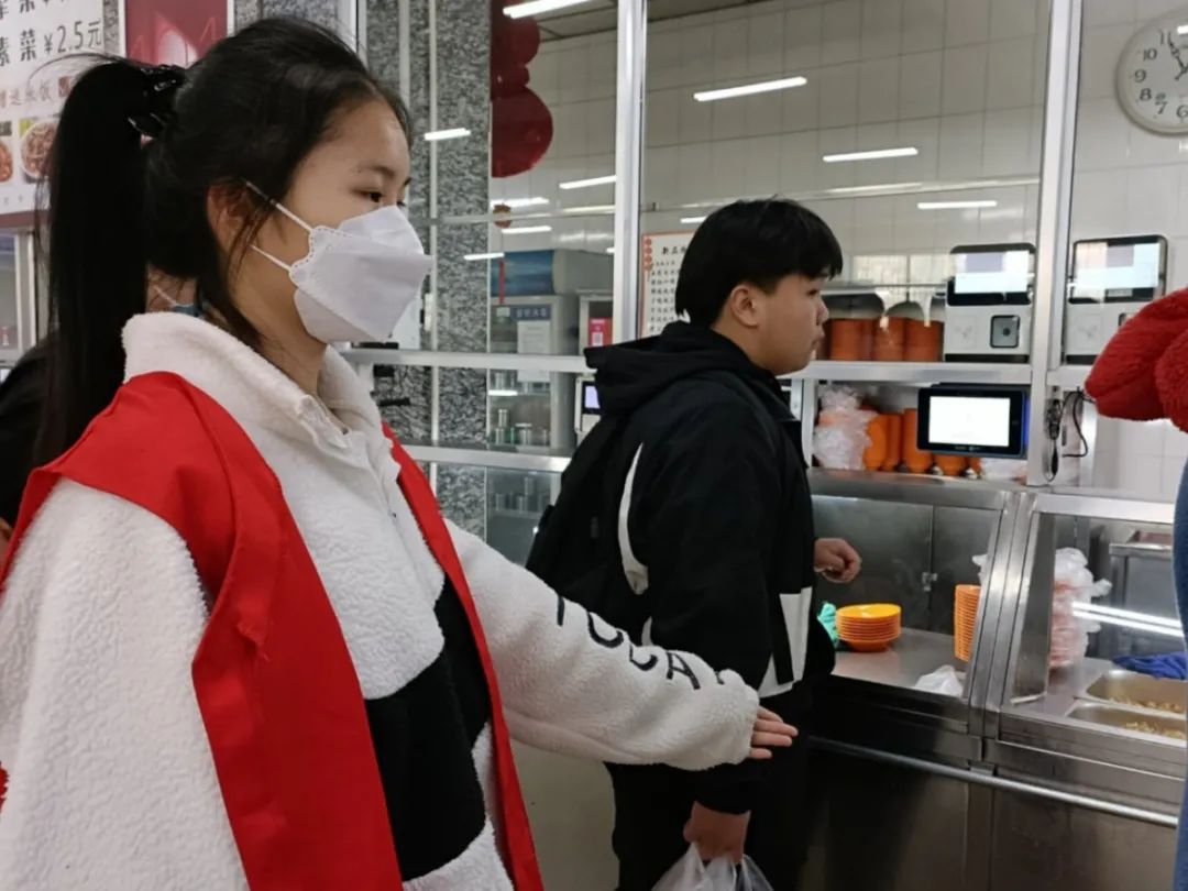 我院志愿者积极参与到此次活动中,筑牢校园疫情防控屏障,共同维护校园安全防线。志愿者在做好自身防护的前提下,积极热情地为大家服务,维持疫情期间食堂的就餐秩序。志愿者们坚守岗位,做好人员疏散工作,并提醒同学们佩戴口罩。食堂入口处,志愿者们检查学生是否佩戴口罩,是否扫码测温。食堂内,志愿者们耐心引导购餐的同学保持一米间隔有序排队,避免扎堆聚集。在活动过程中同学们团结协作、充满干劲,圆满完成任务。