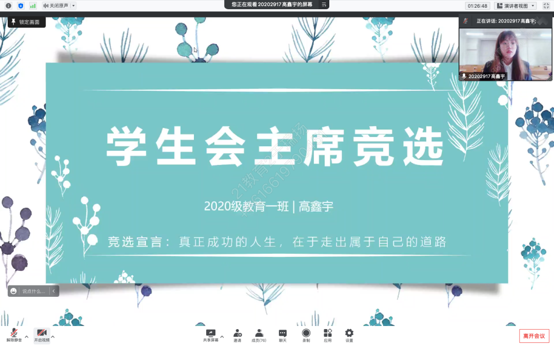 参与本次选举的五位候选人按会前抽签顺序进行竞选演讲,参与竞选的同学按抽签顺序依次发言,他们信心十足地向大家表达了自己对学生工作的认识,对我院学生组织这个大家庭的热爱和对未来工作的规划。