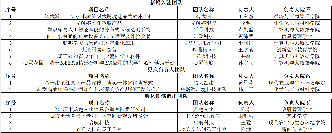 经av漫画 学生科技文化创业园专家组评审,2025年度秋季学期av漫画 学生科技文化创业园学生创业团队调整公示如下: